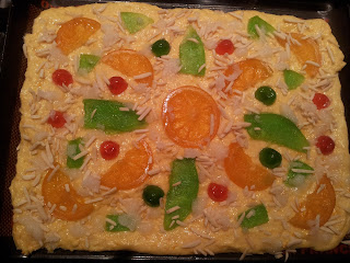 - Decoramos con crema (opcional), frutas confitadas y piñones. Dejamos reposar hasta que doble su volumen aproximadamente dos horas otra vez dentro del horno y sin temperatura.